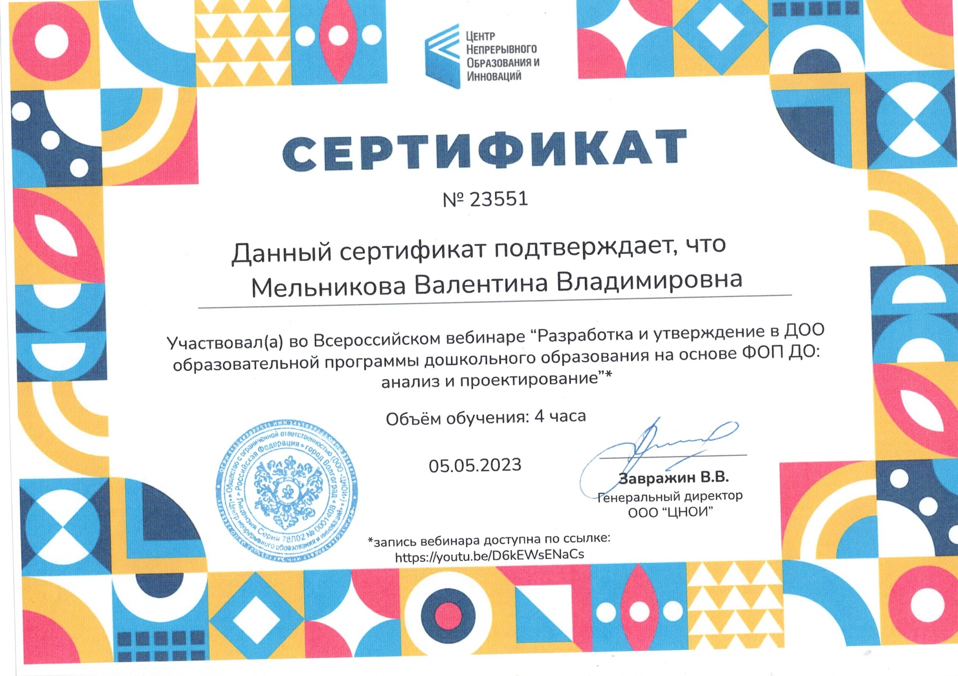 Всероссийский вебинар "Разработка и утверждение в ДОО образовательной программы дошкольного образования на основе ФОП ДО: анализ и проектирование", Центр непрерывного образования и инноваций, 2023 год